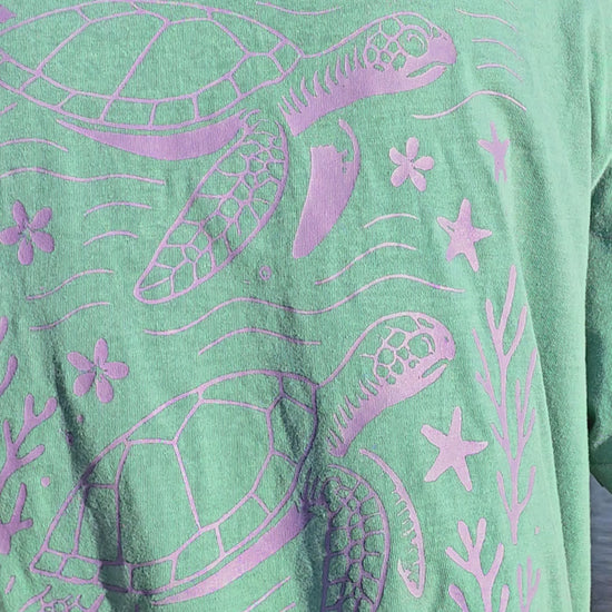 Sail into adventure with Ocean Nomads 🐢🌊 – sea turtles gliding across the reef, framed by corals, flowers, and flowing waves. The lilac artwork pops on the Seafoam color, evoking the freedom of the open sea.